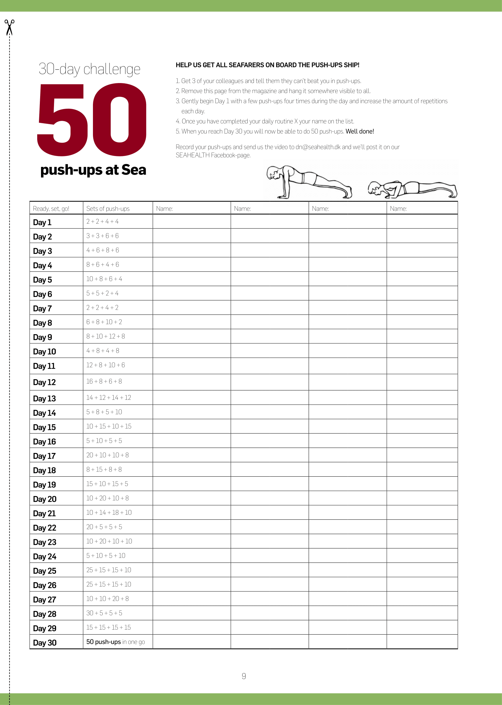 “The idea to conduct this competition came originally from "at SEA issue 1 2016" and the article regarding a 30 days challenge to do 50 push-ups in one go. We developed this into a 20-30 days training session following the set up in the magazine, ending with a competition where a referee will count and set a variable pace which the competitors have to follow in order to distinguish winners. The competition has been conducted three times with all crew involved, some crew members will follow and record the progress according to above training session and others will exercise for themselves and we all meet for the competition.”
